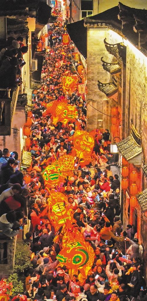 2月7日,安徽省黄山市歙县北岸镇瞻淇村鱼灯巡游流光溢彩,吸引众多游客前来感受徽州年味。樊成柱摄(中经视觉)