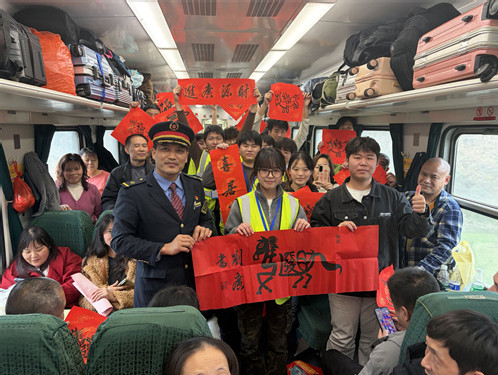 2026年2月11日,是中国传统小年,中国铁路广州局集团公司长沙客运段怀化南线车队值乘东莞东到梁平的春运临客K4807次列车上,长沙客运段工作人员和湖南高速铁路职业技术学院的春运支援学生一起在8号车厢开展“文化进车厢”活动,挥毫泼墨现场书写生肖“马福”,将这些独具特色的作品亲手交到旅客手中,以一种特别的方式为旅客们送上了小年的祝福。