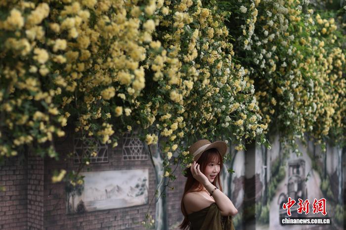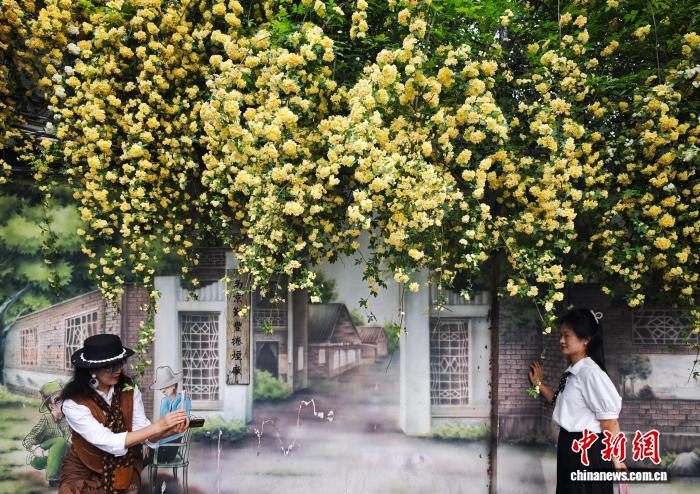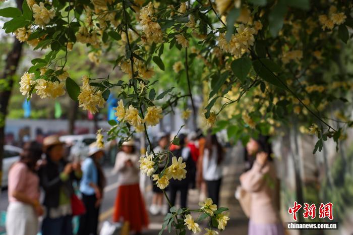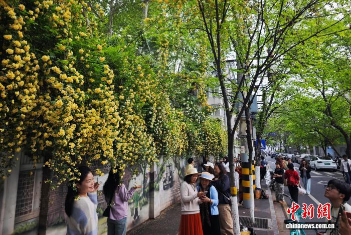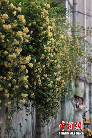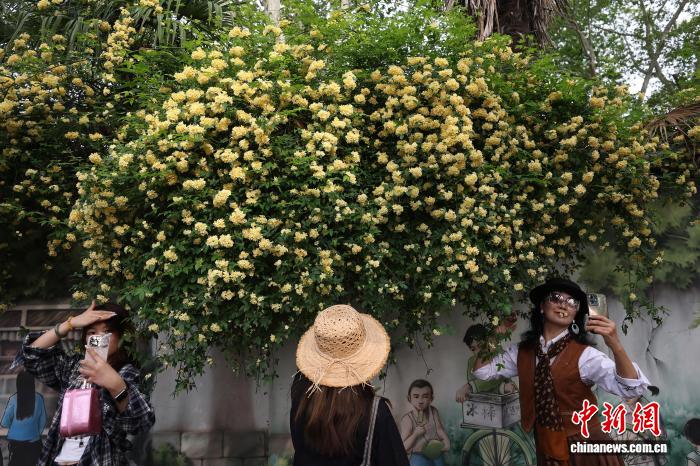 4月10日,江苏南京,市民在碑亭巷盛开的木香花前拍摄照片。中新社 记者 泱波 摄