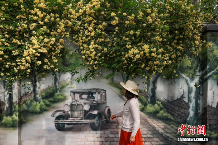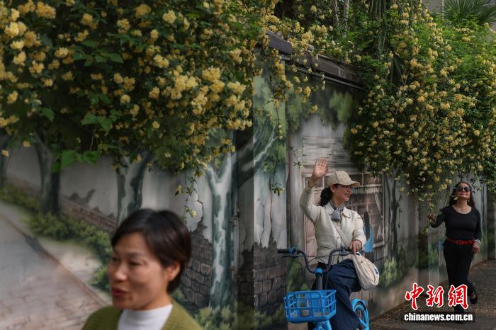 近日,这里如瀑布般的木香花盛开,与讲述当地过往市井生活的百米墙绘“碑亭印记”相得益彰。