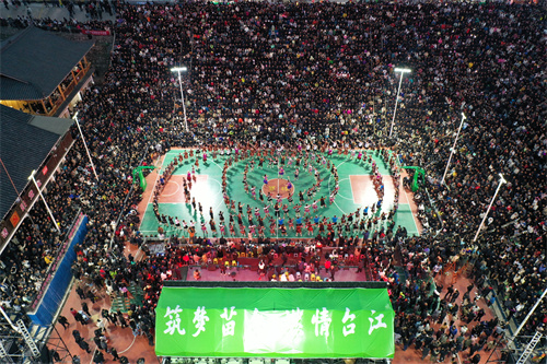 民族文化节目蹦苗迪在村BA球场上上演(无人机航拍图 邰光政摄)