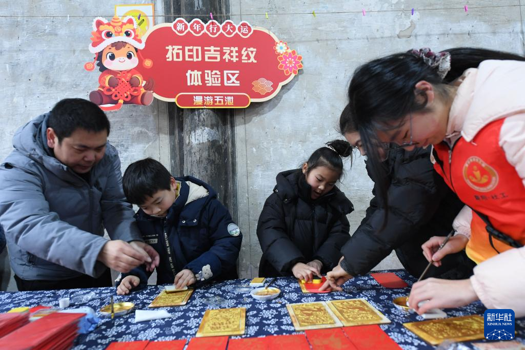 1月31日,在五泄镇十四都村古民居,孩子们在老师的带领下体验吉祥纹拓印。