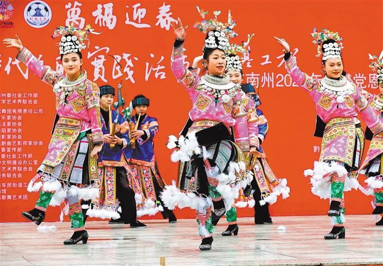 1月31日,贵州省黔东南苗族侗族自治州榕江县车民街道特和社区,演员为观众表演苗族芦笙舞。李长华摄(中经视觉)