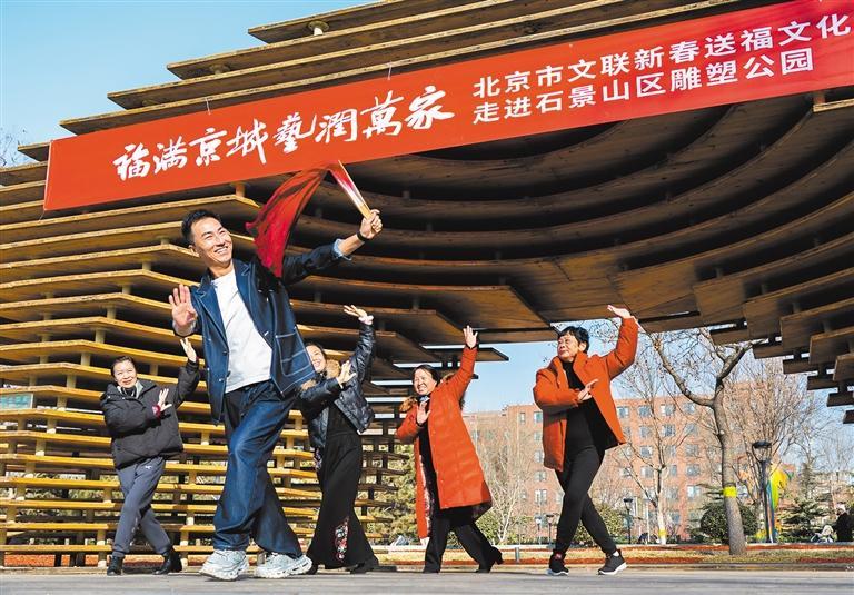 2月4日,北京市石景山区雕塑公园“福满京城艺润万家”文化惠民活动现场,演员与现场观众互动。李文明摄(中经视觉)