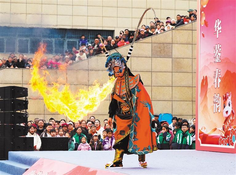 2月3日,四川省华蓥市工人文化宫广场,川剧演员正在表演川剧变脸。周松林摄(中经视觉)