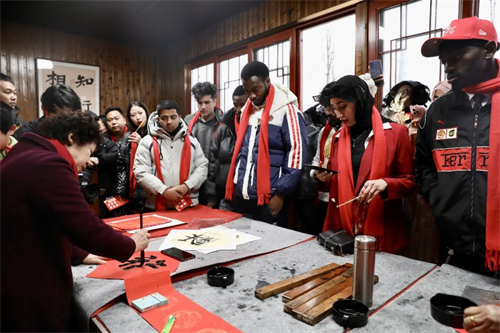 “老师,你看我写的‘福’字怎么样?”2月7日上午,在湖南省衡阳市雁峰区岳屏镇山林村,来自南华大学的留学生们聚在“墨香工坊”前,认真体验着中国书法的魅力。当天,“乡村民俗体验”活动热闹在此开场,来自不同国家的数十位留学生,与本地居民一起沉浸式感受中国新年的独特韵味。