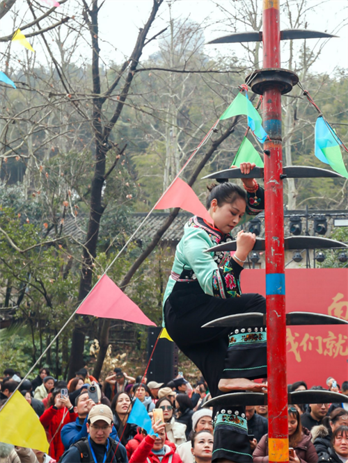 大坪内,苗舞、上刀山、变脸、舞龙舞狮等十余项非遗表演从早到晚轮番上演,鼓掌声、叫好声此起彼伏。