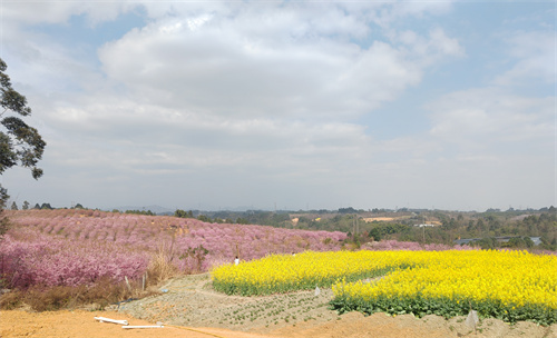 谷中游人如织,扶老携幼的身影随处可见。花树林间,三三两两的人群席地而坐,一家人围坐谈天,好友结伴留影,孩童嬉笑打闹,身旁巴哥犬跟着主人在花径里撒欢,烟火气与花香交织。沿途金黄的油菜花、青翠的田垄相映成趣,与粉樱勾勒出最美的田园画卷。