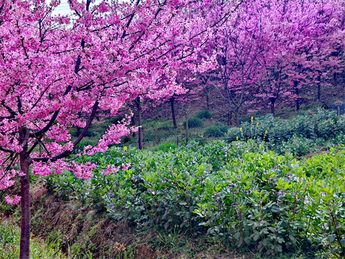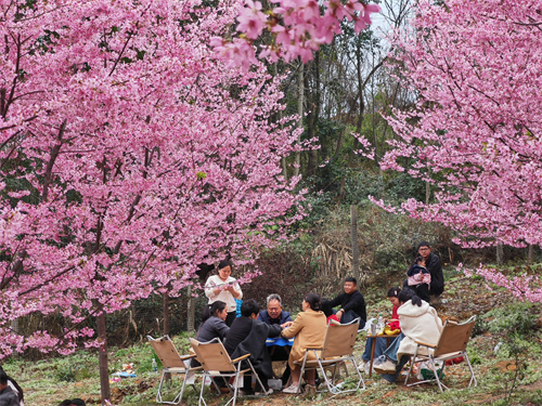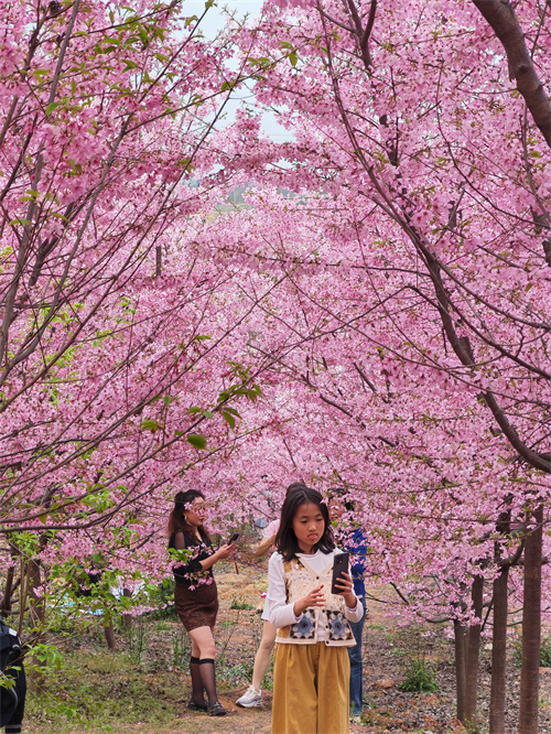 男女老少举着手机拍照、拍抖音,欢声笑语在山谷间回荡,处处是惬意与欢喜。这里虽是小众打卡地,却胜却无数知名景点。清新的空气沁人心脾,灿烂的樱花治愈人心。路边凉粉、烤肠的香气扑鼻,农舍饭馆挂着红灯笼,将诗意与烟火完美相融。