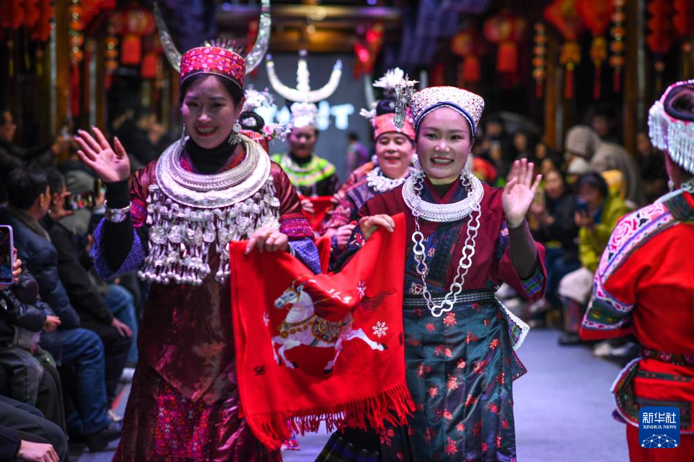 3月8日晚,一场“村T”民族服饰秀在贵州省凯里市苗侗风情园举行。来自黔东南苗族侗族自治州16个县市的绣娘、妇女代表走上T台,展示绚丽多彩的民族服饰之美。