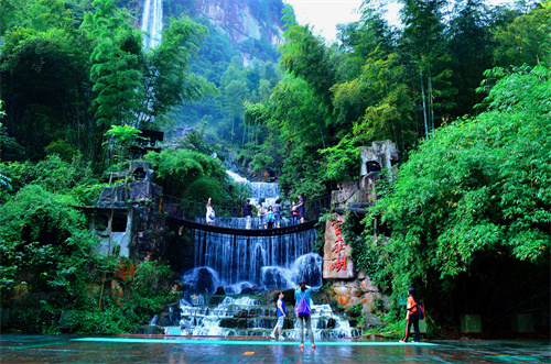 返程途中,游船再次经过奇峰飞瀑。訇然作响的水帘从几十米高的崖壁上倾泻而下,落入潭中激起阵阵水雾。瀑布下方,几位游客正在铁索桥上合影留念。“98年《西游记》剧组在这儿拍过外景,就是《真假美猴王》那集。”一位本地的摄影师傅主动向游客介绍,言语间透着自豪。