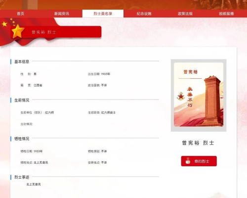 随后,笔者又在《中华英烈网》搜索查找“曾宪裕”烈士,和《烈士英名录》上的姓名、籍贯基本相符的,可能为兴国籍的“曾宪裕”烈士。据《中华英烈网》登载:曾宪裕烈士,籍贯江西省(兴国),生前单位(部队)职务为“红六师战士”,牺牲日期为“1933年”,牺牲地点为“北上无音讯”,牺牲原因和安葬地点均为“不详”。就此,笔者认为牺牲日期可能有误,不应为“1933年”,那时长征还没开始,可能是1933年在“创造一百万铁的红军”时参军时间。“曾宪裕”所在的红六师,属红三军团,是在1934年10月开始长征的。1935年1月在遵义整编时撤销红六师番号,人员分编入红四师、红五师。